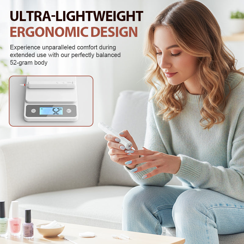CONCEPTION ERGONOMIQUE ULTRA-LÉGÈRE - Profitez d'un confort inégalé lors d'une utilisation prolongée grâce à son poids plume de 52 grammes. Sa forme profilée épouse parfaitement la main, réduisant la fatigue musculaire et offrant un contrôle optimal pour les nail art les plus précis et les limage les plus fins. Réaliser des motifs complexes devient ainsi un jeu d'enfant.