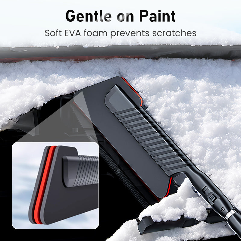 MOUSSE EVA SANS DANGER POUR LA PEINTURE - Dotée d'une tête en mousse EVA dense et multicouche, cette brosse à neige déneige et dégivre efficacement tout en préservant la carrosserie de votre voiture. Contrairement aux brosses traditionnelles à poils qui peuvent rayer ou abîmer la peinture, la mousse souple et flexible glisse en douceur sur la peinture, les rétroviseurs et les vitres. Sa conception non absorbante empêche l'accumulation d'eau et les résidus, pour une finition impeccable, sans traces, même par temps glacial.