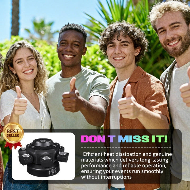 CONCEPTION DYNAMIQUE À SIX BRAS - Ce projecteur est doté de six bras indépendants, chacun projetant un faisceau puissant. Il crée des effets lumineux saisissants qui emplissent l'espace et des spectacles de lumière dynamiques qui captivent le public et subliment l'ambiance de votre événement.